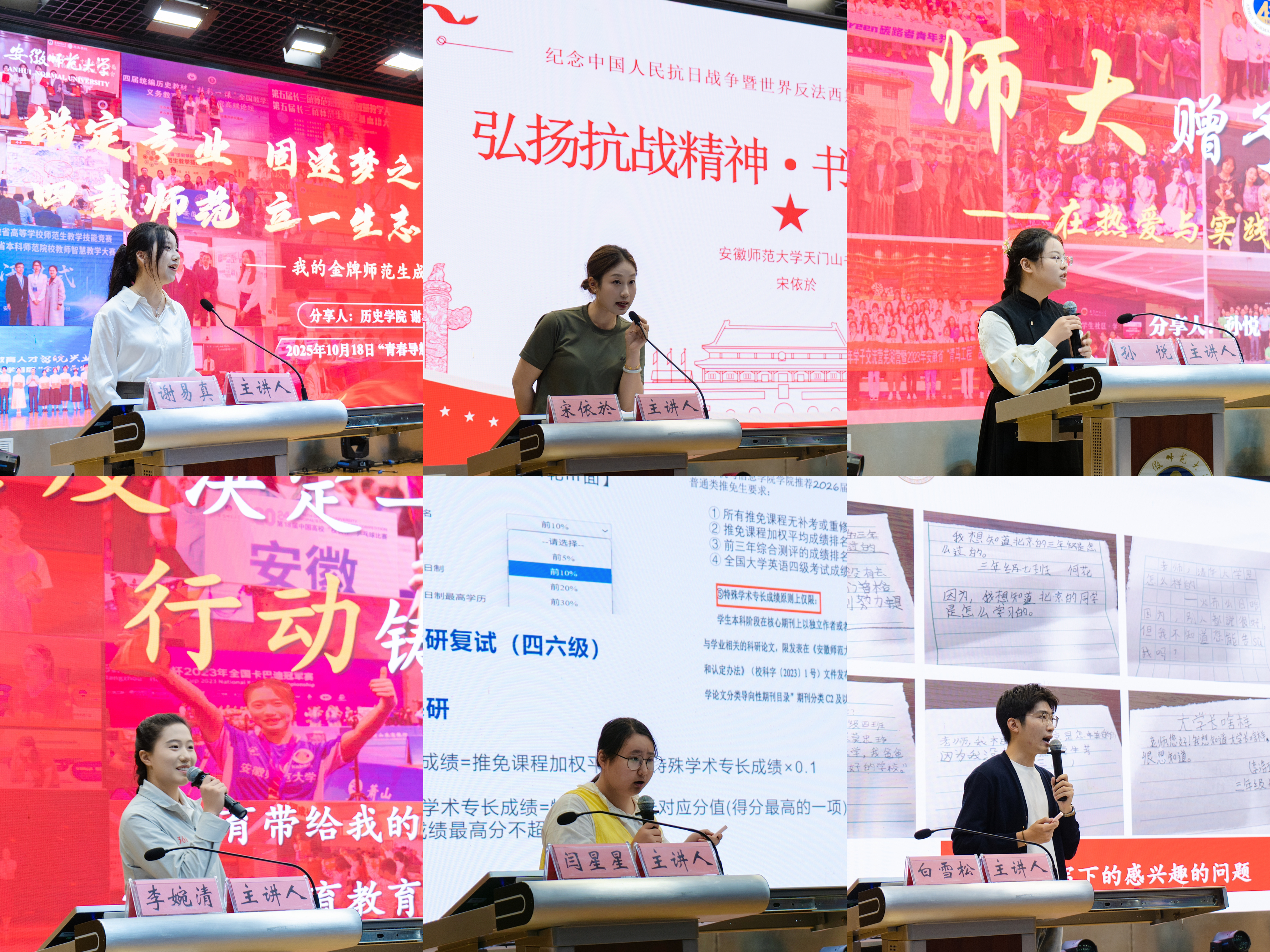 历史学(师范)专业2025届本科毕业生、第21届“师大骄子”十佳大学生标兵、安徽师范大学首届“金牌师范生”代表谢易真以“锚定专业固逐梦之基”为主线,分享了她在师范道路上从坚定热爱到千锤百炼的成长历程,鼓励学弟学妹扎根专业、厚积薄发;汉语言文学(专升本)专业2024级本科生宋依於结合参军经历,讲述了军旅生活中追求极致、心怀家国的精神锤炼,号召同学们在伟大时代中书写无悔青春;马克思主义理论专业2023级硕士研究生、第21届“师大骄子”十佳大学生标兵、校第24届研究生支教团团长孙悦分享了她在凉山普格县支教期间推动推普工作、发起公益项目的实践经历,展现了师大学子以志愿星火传递温情的担当;体育教育专业2022级本科生、2023年全国卡巴迪冠军赛亚军李婉清从勤学笃行、多元实践等角度出发,分享了平衡学业与工作的经验,勉励同学以梦为舟、勇于突破;物联网工程专业2022级本科生、第十四届“挑战杯”中国大学生创业计划竞赛全国终审决赛银奖获得者闫星星围绕“向竞赛而学,锤炼过硬本领”主题,介绍了参与高水平学科竞赛的心得,鼓励大家敢于尝试、迈出第一步;戏剧与影视专业2025级硕士研究生、第20届“师大骄子”十佳大学生标兵、校第26届研究生支教团普格分队队长白雪松从学生引领、志愿服务与理论宣讲等多重身份出发,分享了在西部计划中的成长与感悟,号召同学们以奋斗姿态诠释青春担当。宣讲员们的精彩分享获得现场同学的一致好评,现场气氛活跃,掌声不断。